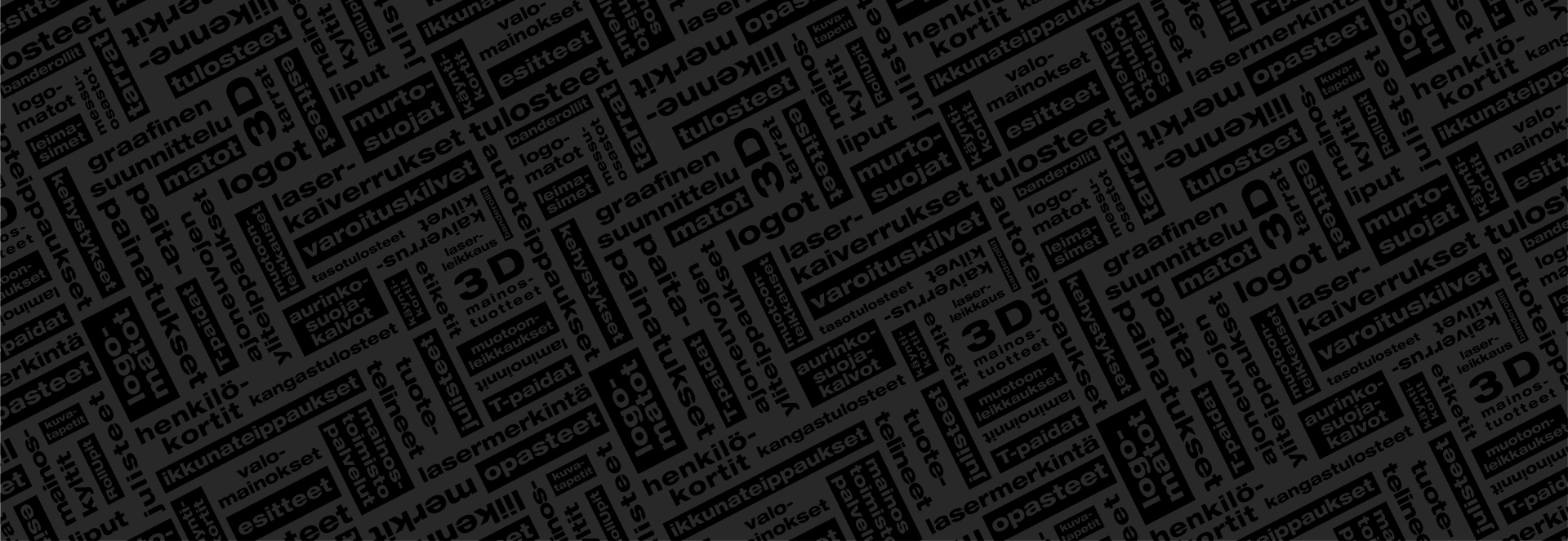 Suomen monipuolisimpana mainostehtaana saat meiltä samalta luukulta kaikki vaalimainokset aina esitteistä ja tarroista messutuotteisiin, kyltteihin ja autoteippauksiin.