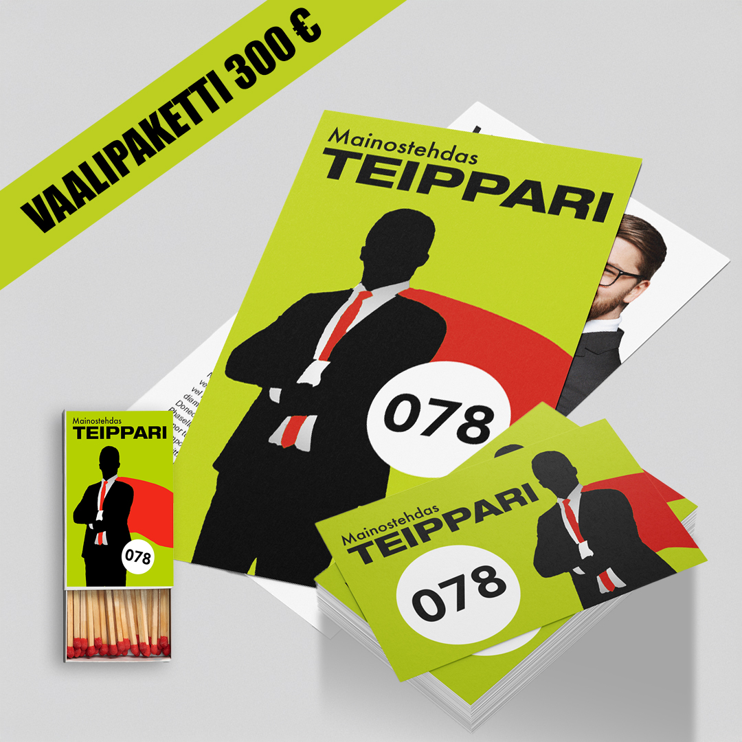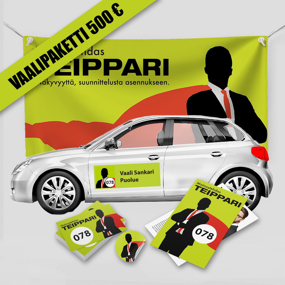 Rakenna oma 300€ arvoinen vaalimainospakettisi ja saat 100 kpl tarroja (50mm pyöreä) kaupan päälle! Valitse vapaasti tarjoamistamme tuotteista ja varmista, että viestisi tavoittaa oikeat ihmiset.